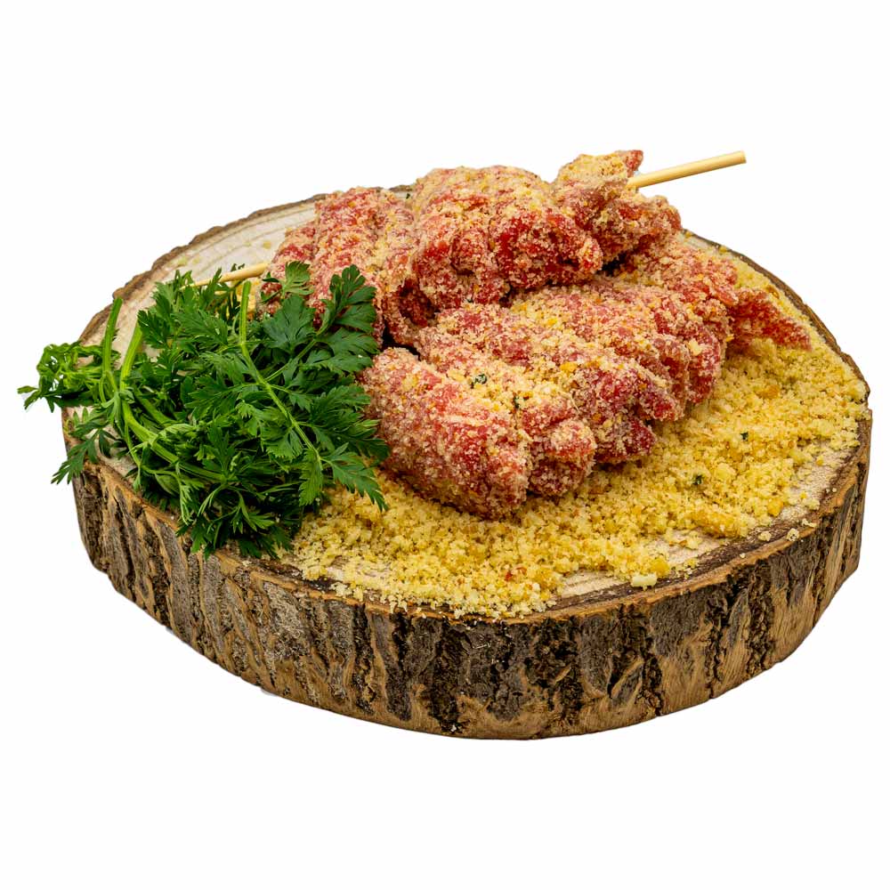 Gli involtini sono ricoperti da una panatura di mollica fatta in casa condita con grana, prezzemolo e olio EVO.